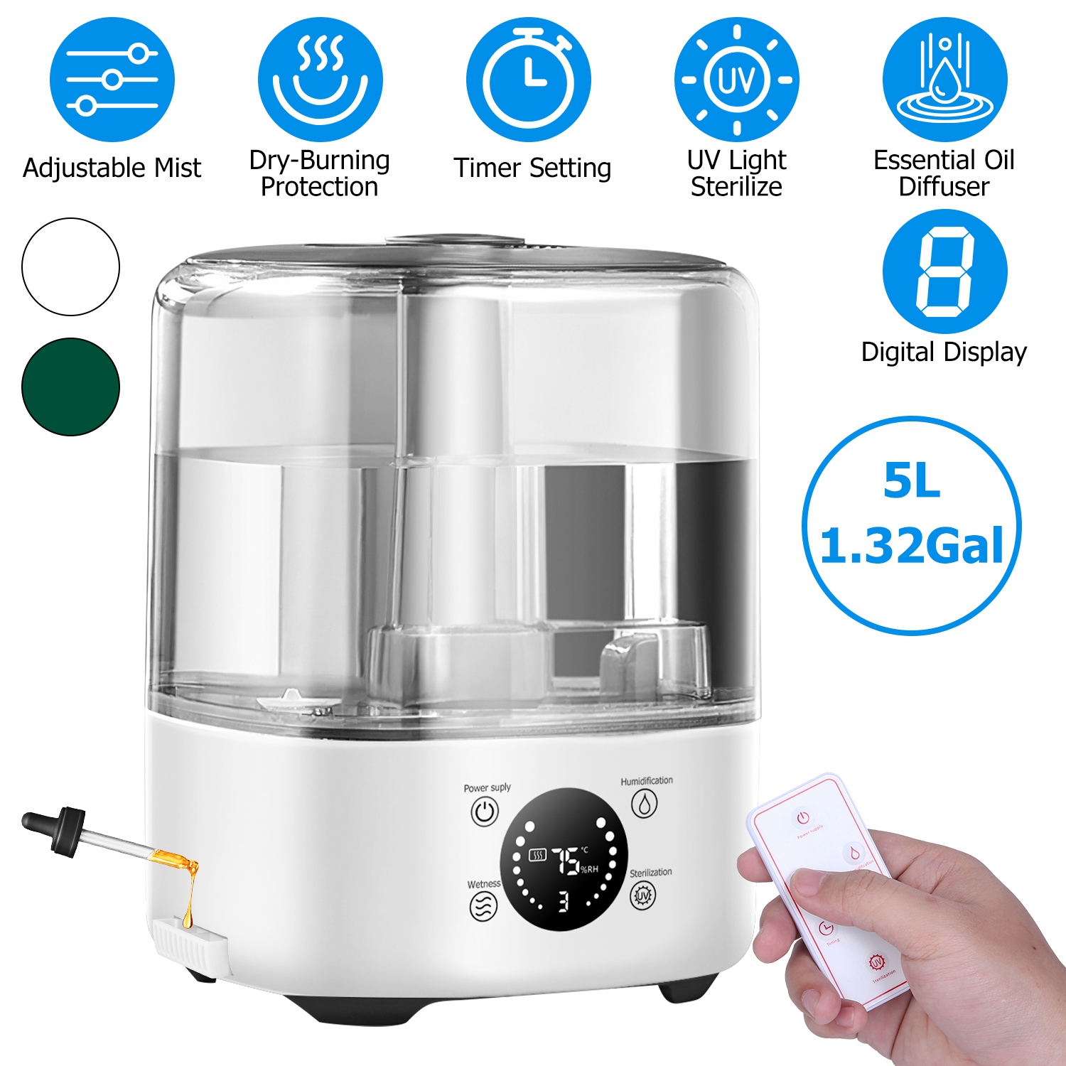 5L/1.32Gal Ultrasonic Air Humidifier Electric Mist Humidifier with Temperature Humidity Sensor Timer Setting UV Light Adjustable Mist Level Quiet Esse