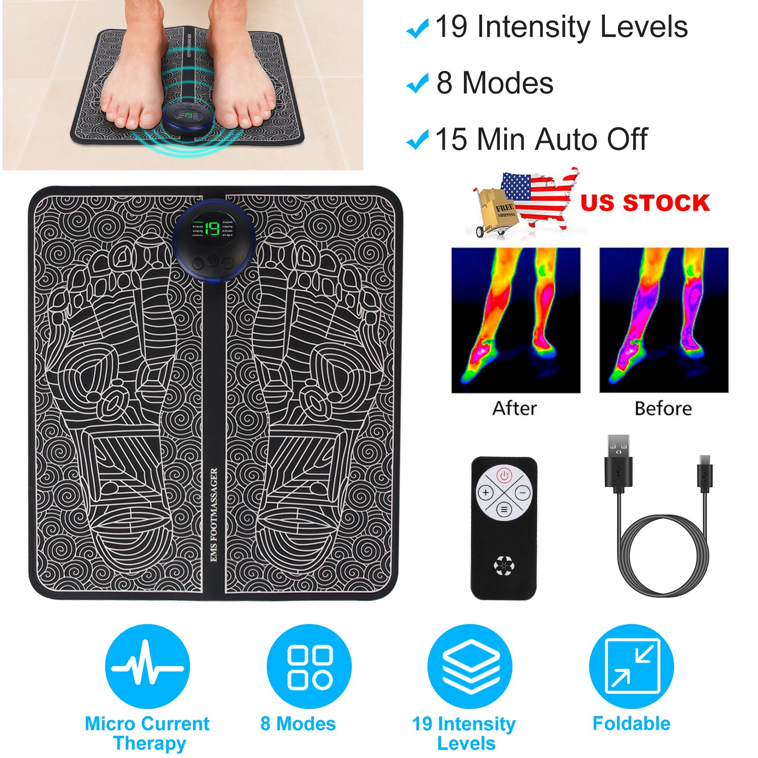 Home > Foot Massage Pad Electric Stimulator Massager Unit Leg Reshaping Muscle Pain Relax Foldable Massage Mat with 8 Modes 19 Intensity Levels Remote Contro