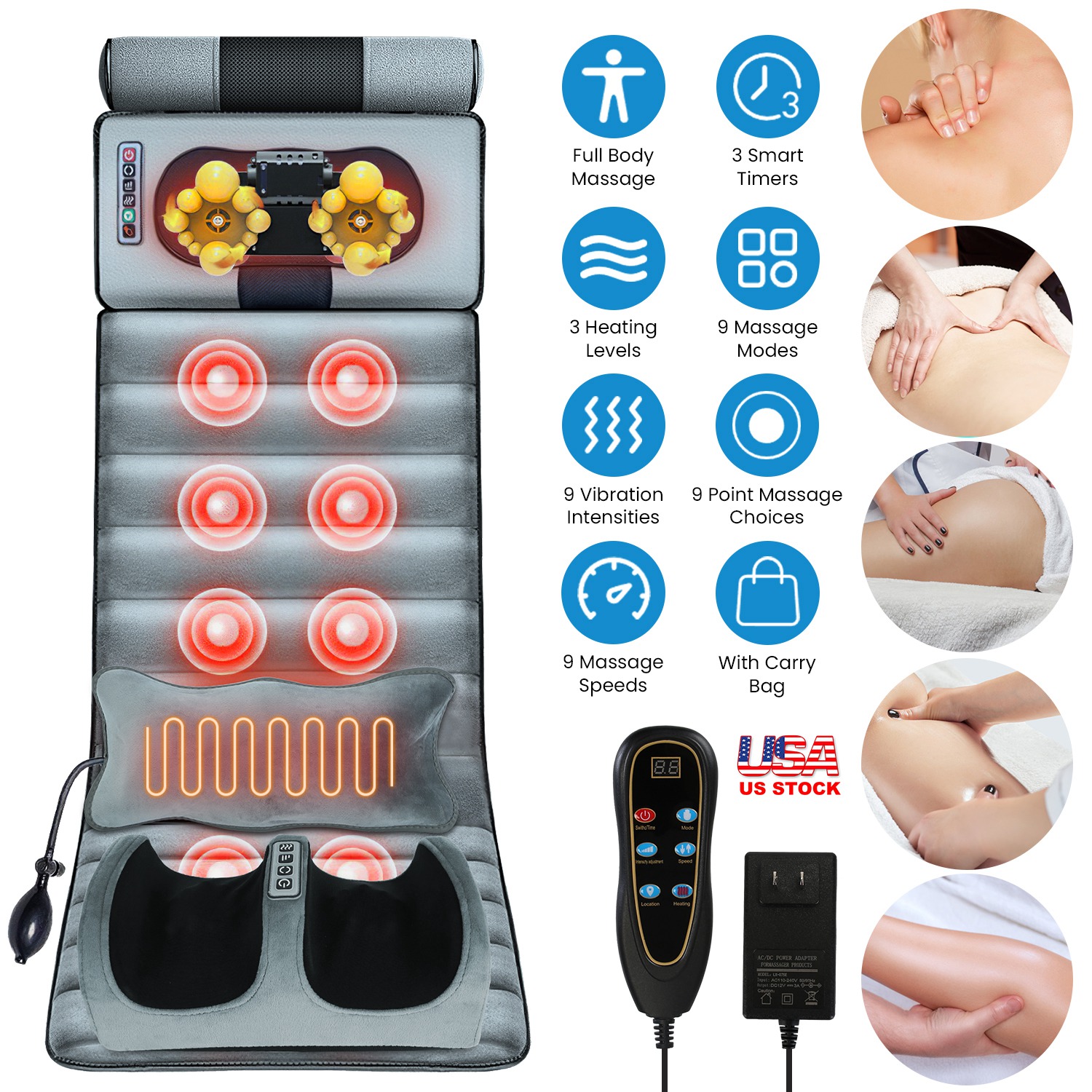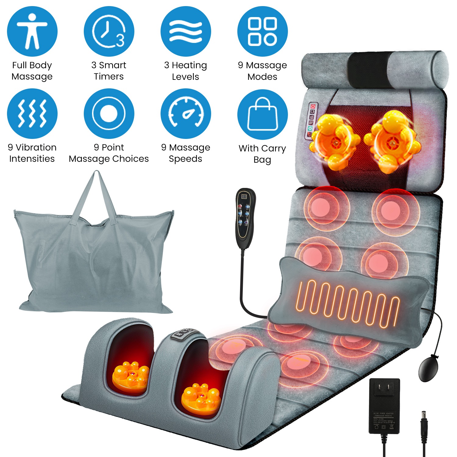 Massage Mat Specifications Function: Vibration(9 Massage Modes + 9 Points Vibration Selection + 9-Level Speeds + 9-Level Intensity); Heating(On Waist Part; 3 Levels); Timer[10Mins(Auto)/20Mins/ 30Mins]
